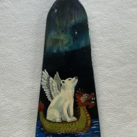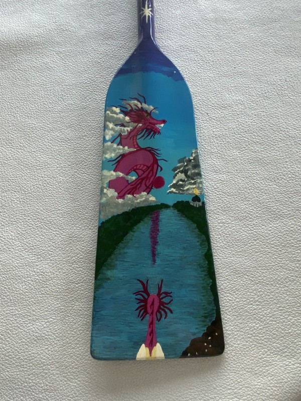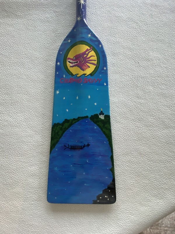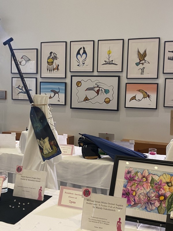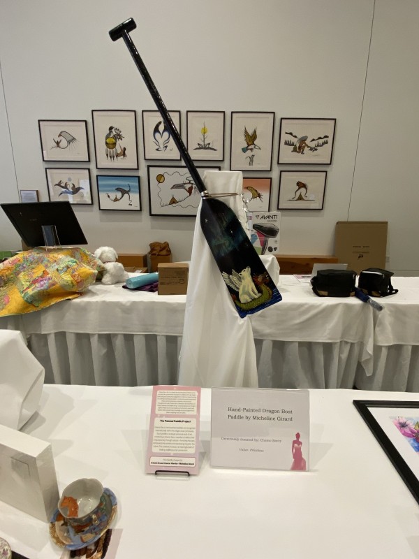Thank you to Micheline Girard (polar bear with wings) and Vicki Young (dragon overlooking the river) who were the artists of these spectacular paddles. You ladies did a marvelous job, and your creativity is just unbelievable. Alongside each paddle was a description of our team and why we paint paddles.
